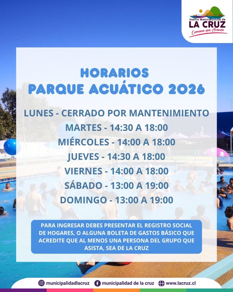 Para poder ingresar recuerda presentar tu Registro Social de Hogares o una boleta de servicios básicos que acredite que al menos una persona del grupo que asista, tenga residencia en la comuna de La Cruz.