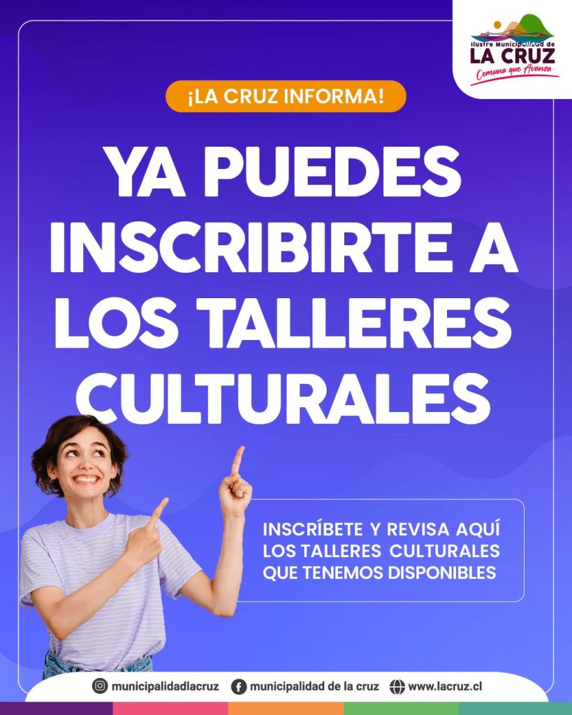 Los Talleres Culturales de la Ilustre Municipalidad de La Cruz son espacios formativos y participativos abiertos a la comunidad, orientados a promover la creatividad, la expresión artística y el acceso equitativo a la cultura. Están dirigidos a niñas, niños, jóvenes, personas adultas y mayores, y abarcan diversas disciplinas como artes escénicas, música, danza, artes visuales, oficios creativos y propuestas inclusivas.