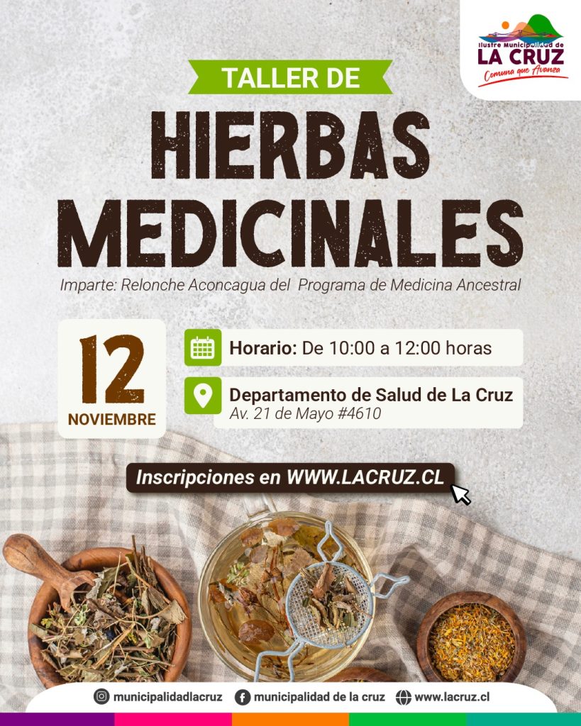 Fecha: Miércoles 12 de NoviembreHorario: 10:00 am a 12:00 horasLugar: Departamento de Salud (Av. 21 de Mayo #4610)Imparte: Relonche Aconcagua del Programa de Medicina Ancestral