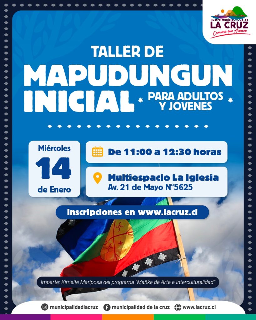 Vecinas y vecinos, les invitamos a inscribirse en el Taller de Mapudungún Inicial que se realizará el miércoles 14 de enero, de 11:00 a 12:30 horas en el Multiespacio La Iglesia (Av.21 de Mayo #5625), una instancia para acercarse a la lengua y cultura mapuche.