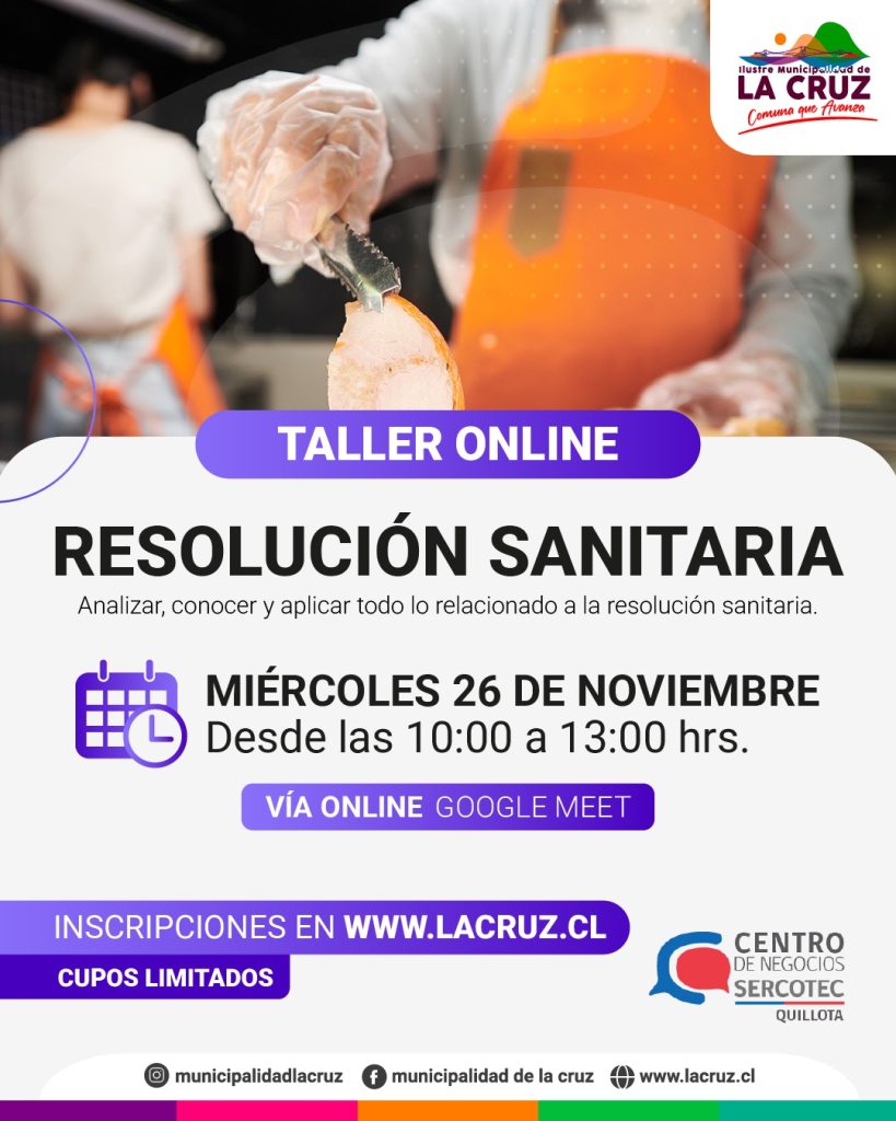 Vecinas y vecinos, les informamos que ya está disponible la inscripción para el taller impartido por SERCOTEC, dirigido a emprendedoras y emprendedores del ámbito alimentario que buscan regularizar sus negocios y asegurar la inocuidad de sus productos.