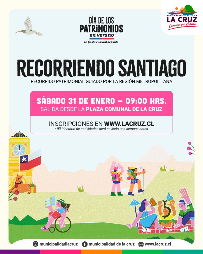 La Oficina de Turismo de la Ilustre Municipalidad de La Cruz invita a vecinas y vecinos a ser parte de una salida patrimonial a la ciudad de Santiago, en el marco del Día de los Patrimonios en Verano.